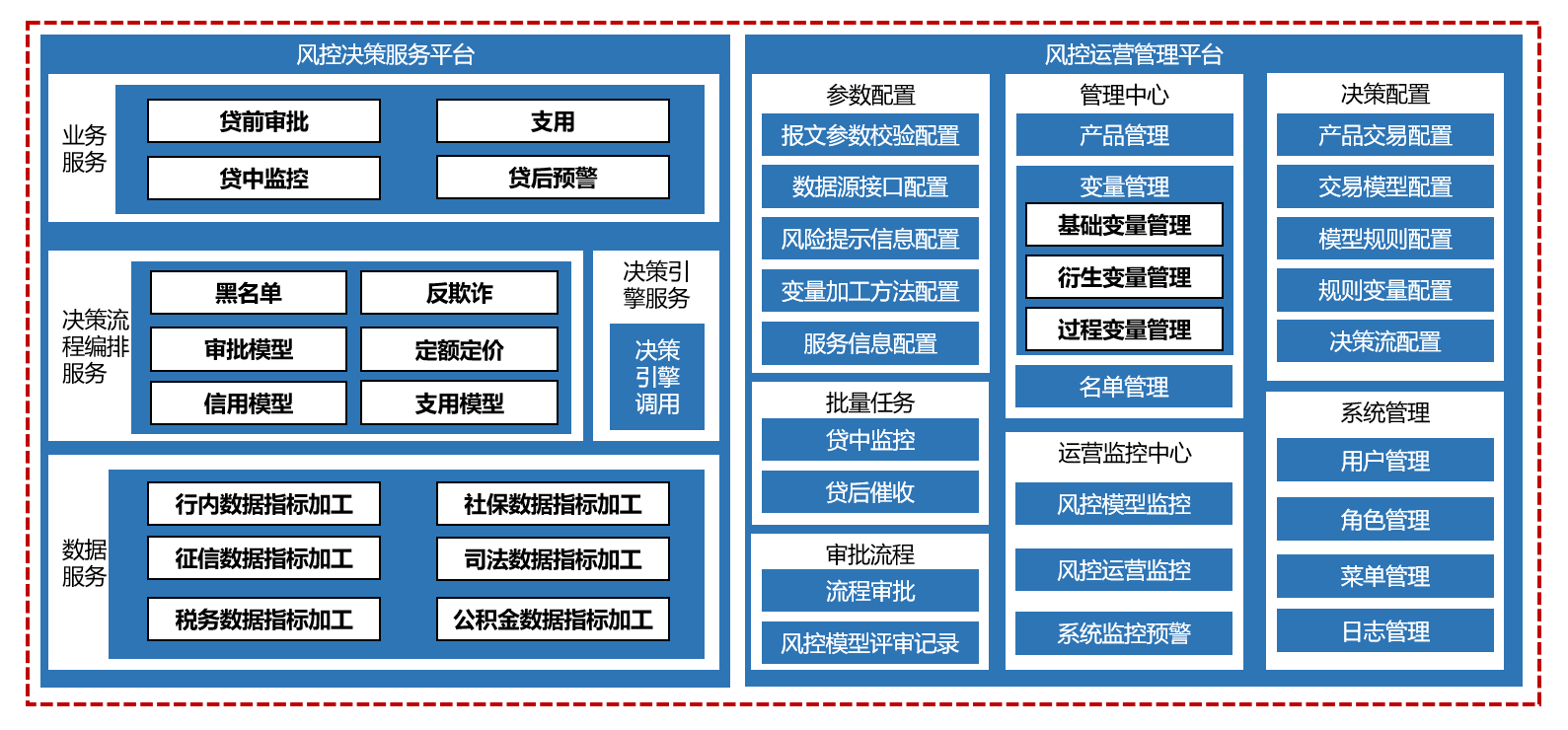 大數據智能風控解決方案旨在通過風險決策服務平臺與外部數據平臺對接,接入大量內外部數據通過內部變量、數據服務、風控模型調用加工后交由風險決策引擎進行風險識別,防范交易和貸款業務中的潛在風險,提升業務安全性,保障客戶和銀行的資金安全。