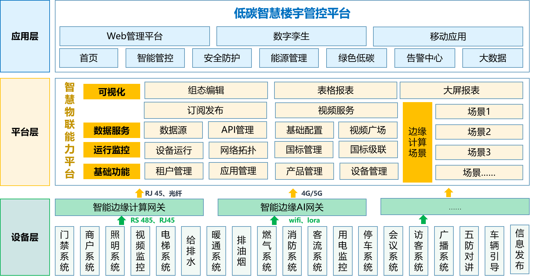 低碳智慧樓宇管控平臺,是基于智慧物聯網、人工智能、智慧能源等多種技術,運用“云-管-邊-端”智慧物聯體系架構,實現園區在智慧安防、設備運維、節能降耗、低碳環保等維度全方位的智慧化管理,有效降低企業人力成本,提升管理運維效率,助力園區達成“雙碳”指標。